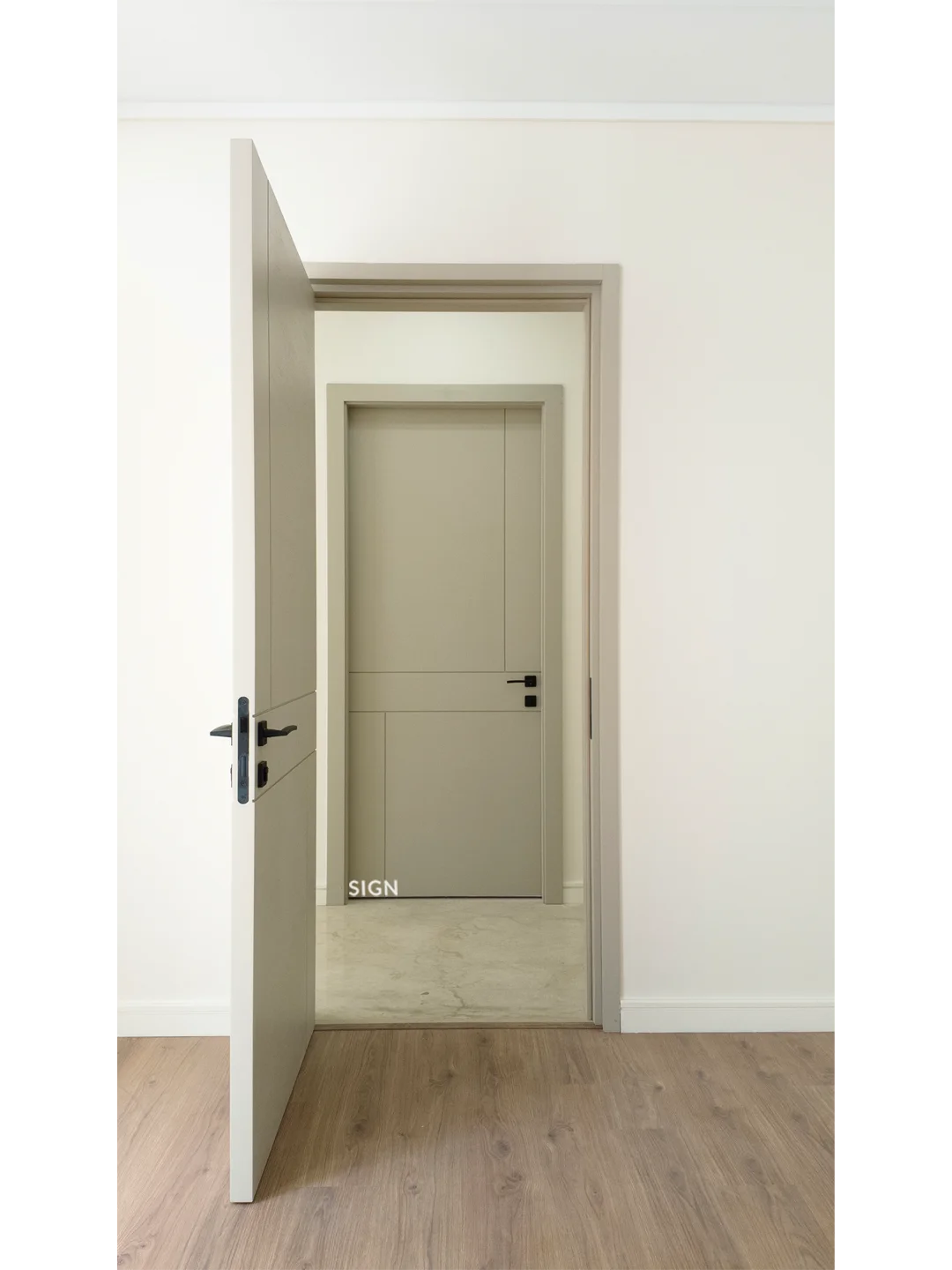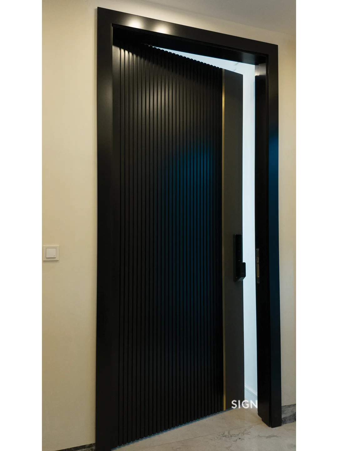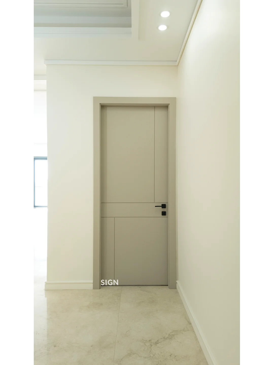 در این پروژه، درب ورودی با ترکیب رنگ پلیاورتان و استیل، دستگیره دیجیتال PHILIPS و لولای مخفی 3D طراحی شده تا ظاهری مدرن و ایمن داشته باشد. درب داخلی نیز با سبک مینیمال، از ترکیب چوب و MDF با پوشش پلیاورتان ساخته شده و جلوهای ساده و شیک به فضا میبخشد.